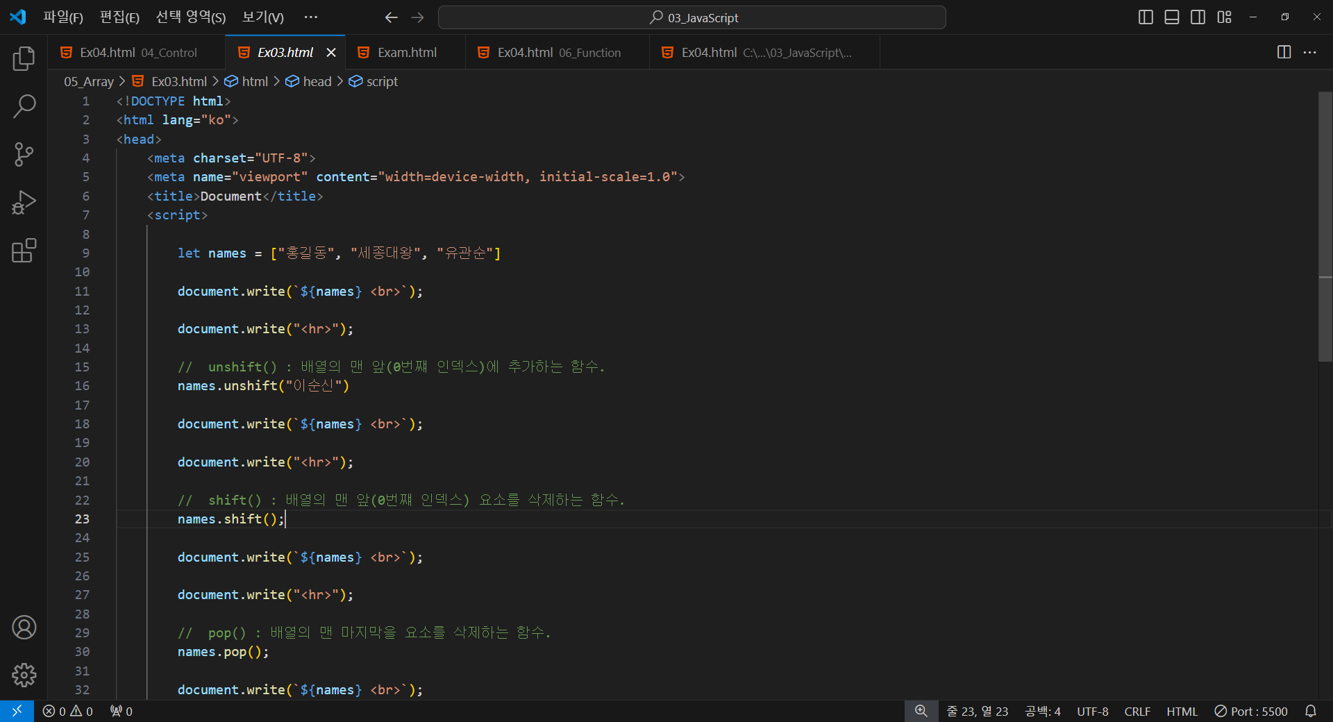 // shift() : 배열의 맨 앞(0번쨰 인덱스) 요소를 삭제하는 함수.