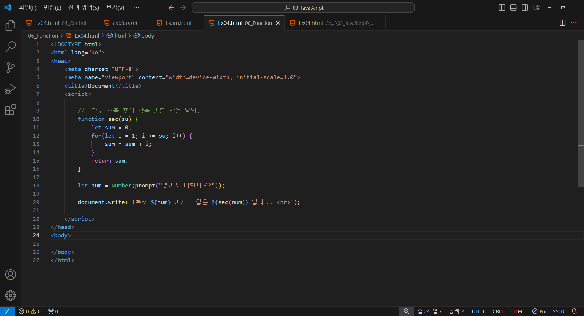 document.write(`1부터 ${num} 까지의 합은 ${sec(num)} 입니다. <br>`);