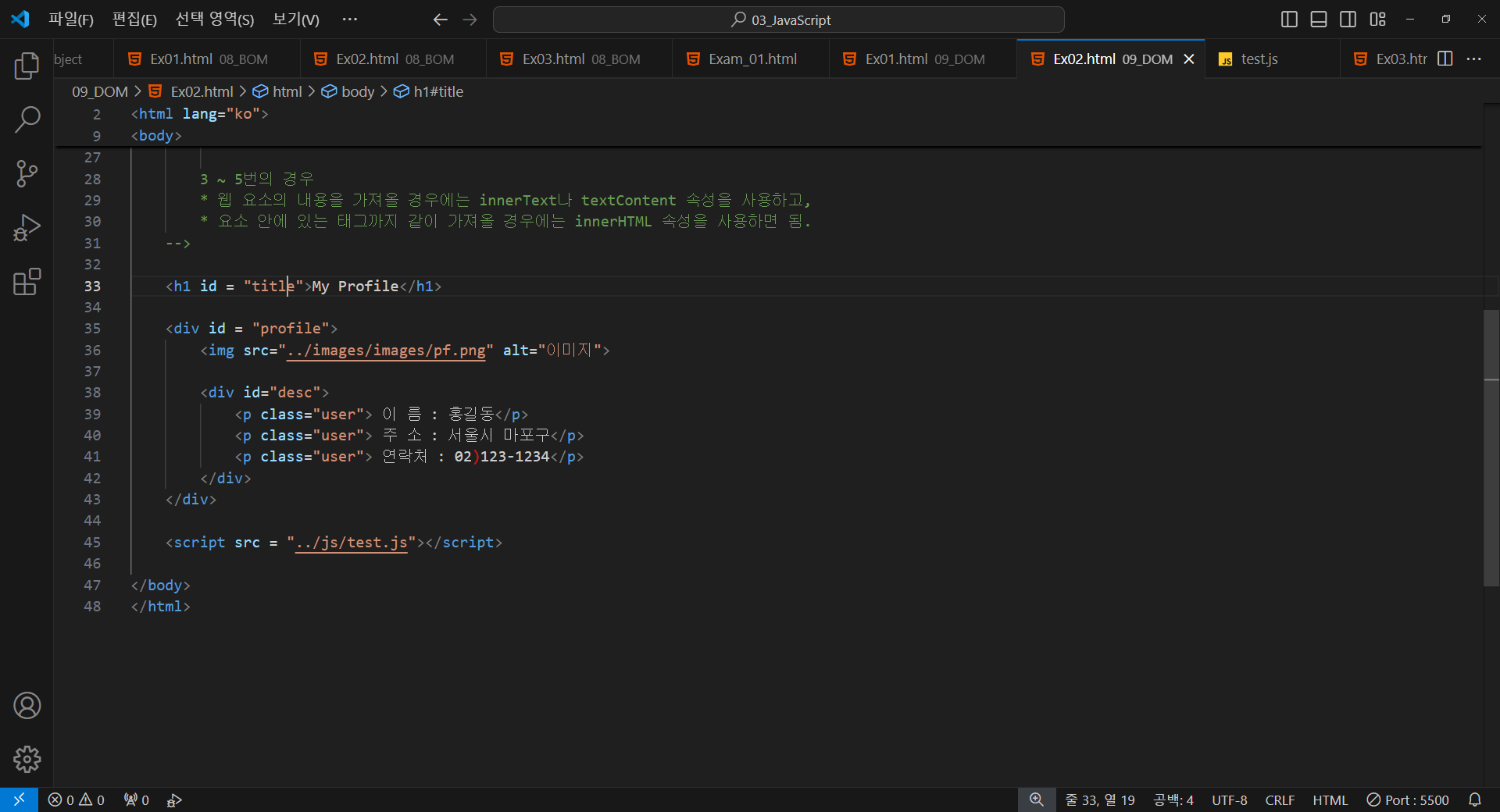 * 요소 안에 있는 태그까지 같이 가져올 경우에는 innerHTML 속성을 사용하면 됨.