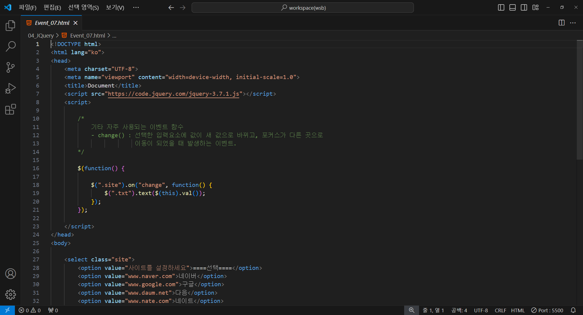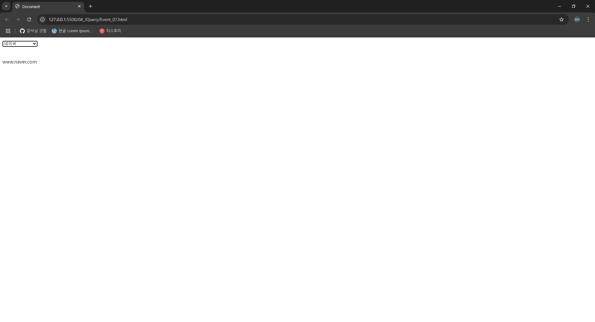 - change() : 선택한 입력요소에 값이 새 값으로 바뀌고, 포커스가 다른 곳으로