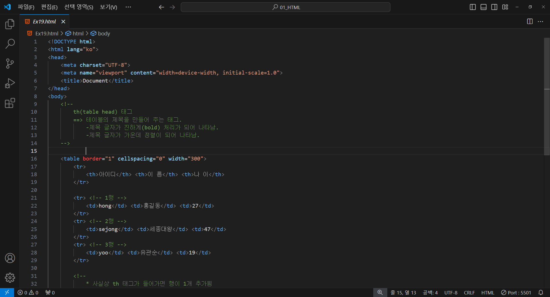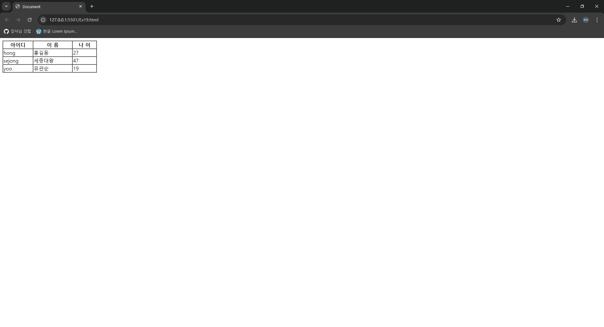 <th>아이디</th> <th>이 름</th> <th>나 이</th>