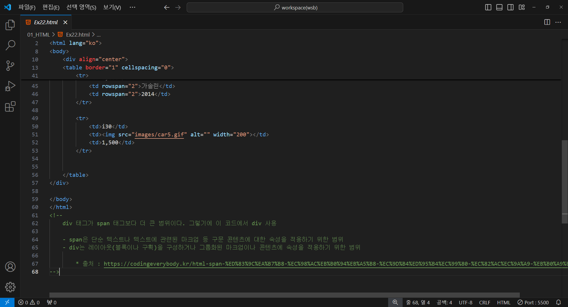 div 태그가 span 태그보다 더 큰 범위이다. 그렇기에 이 코드에서 div 사용