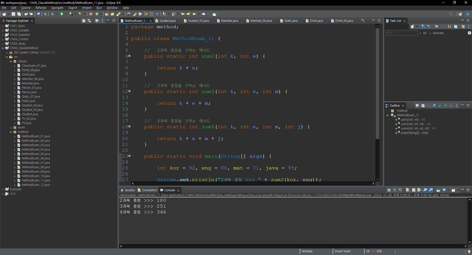 System.out.println("4과목 총점 >>> " + sum4(kor, eng, mat, java));