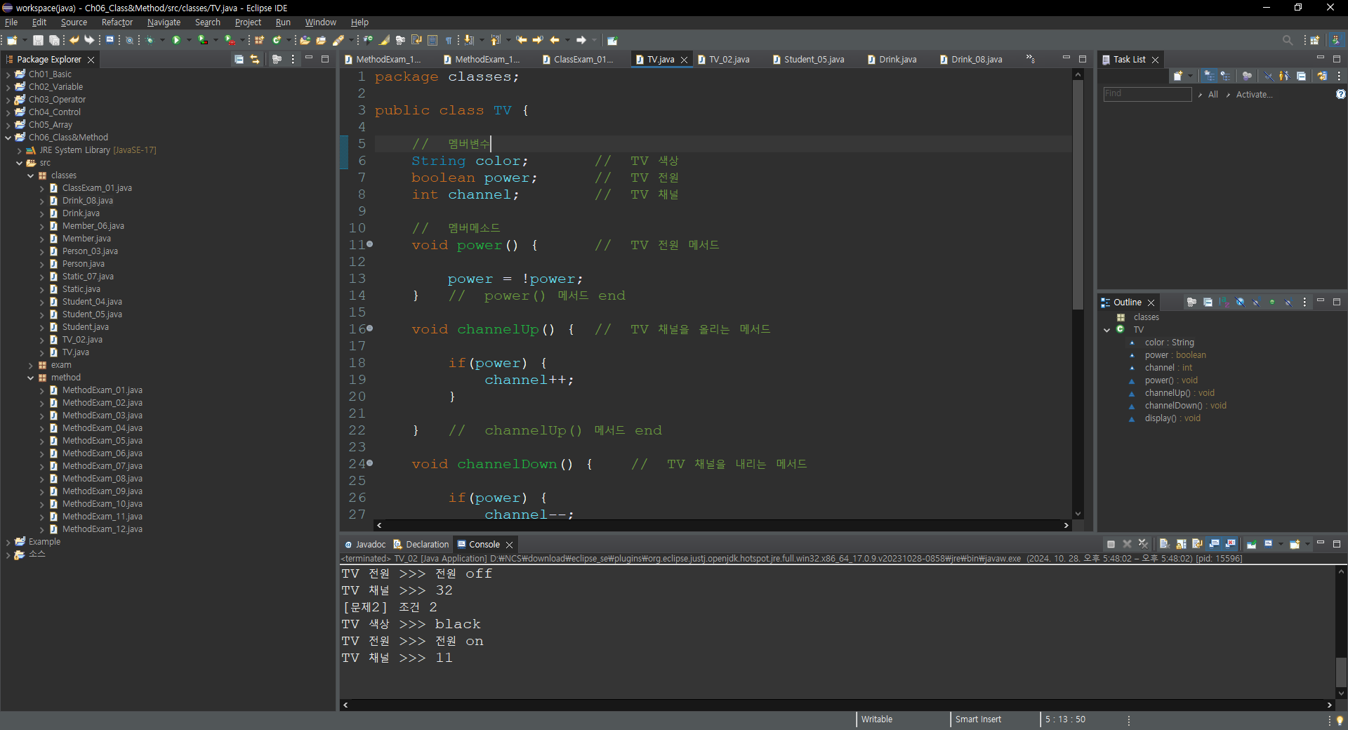 tv.channelUp(); // 채널을 증가시키는 메서드 호출