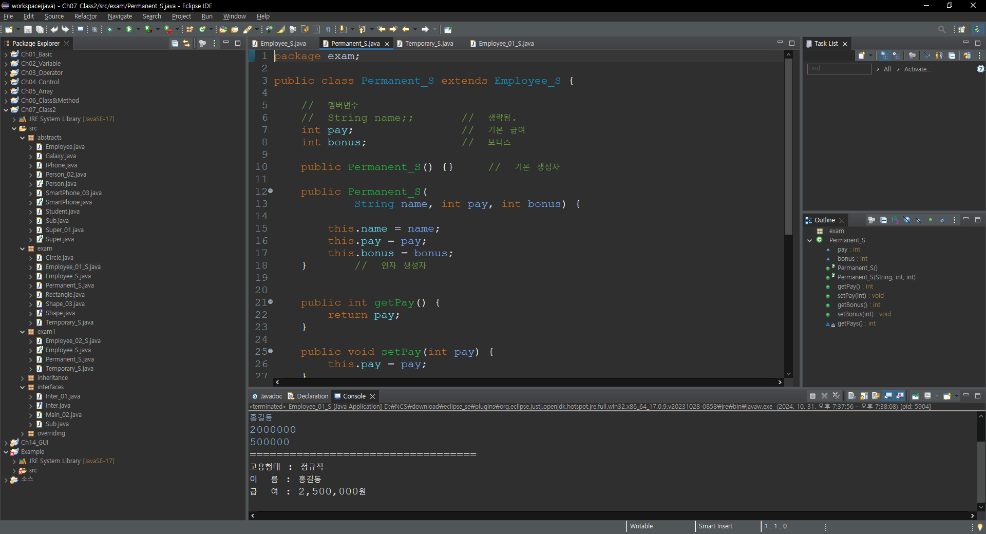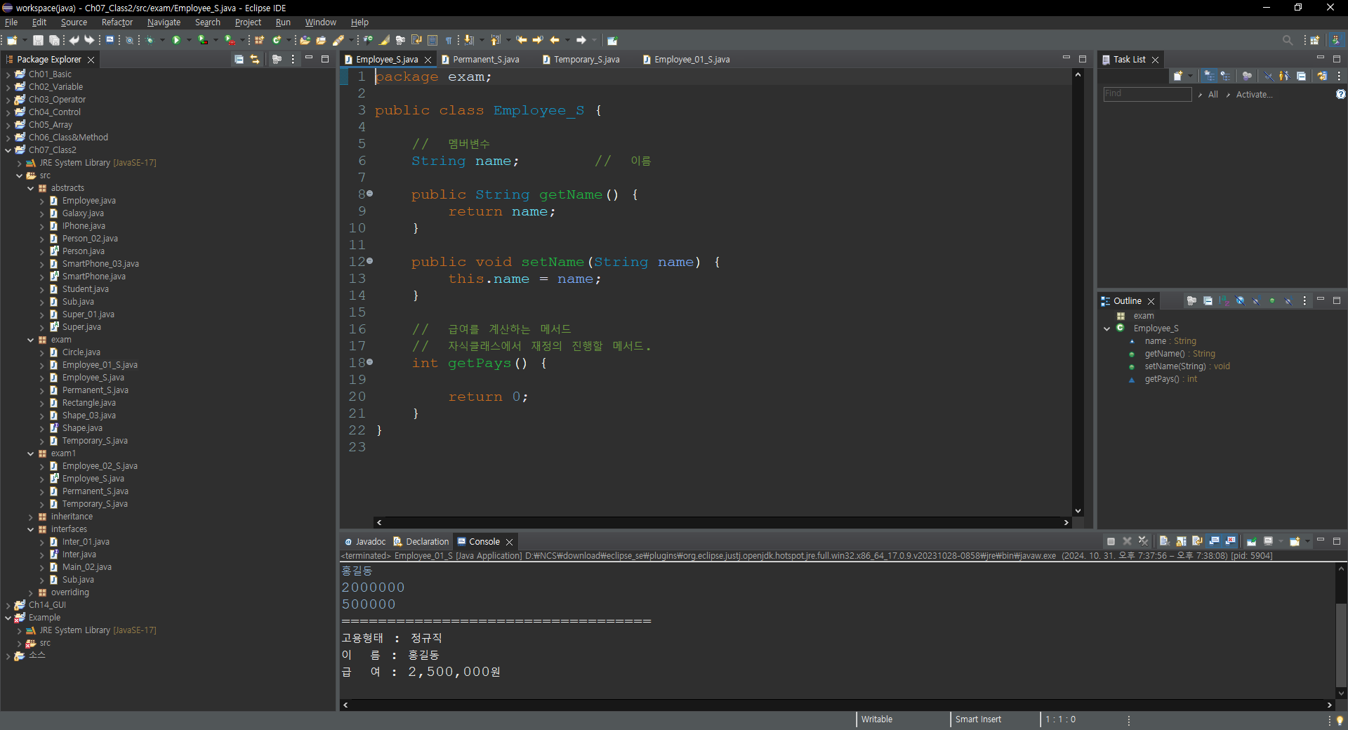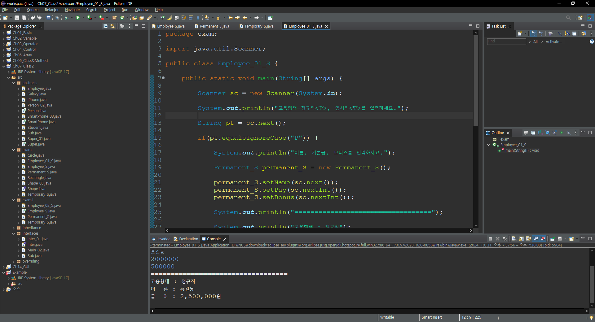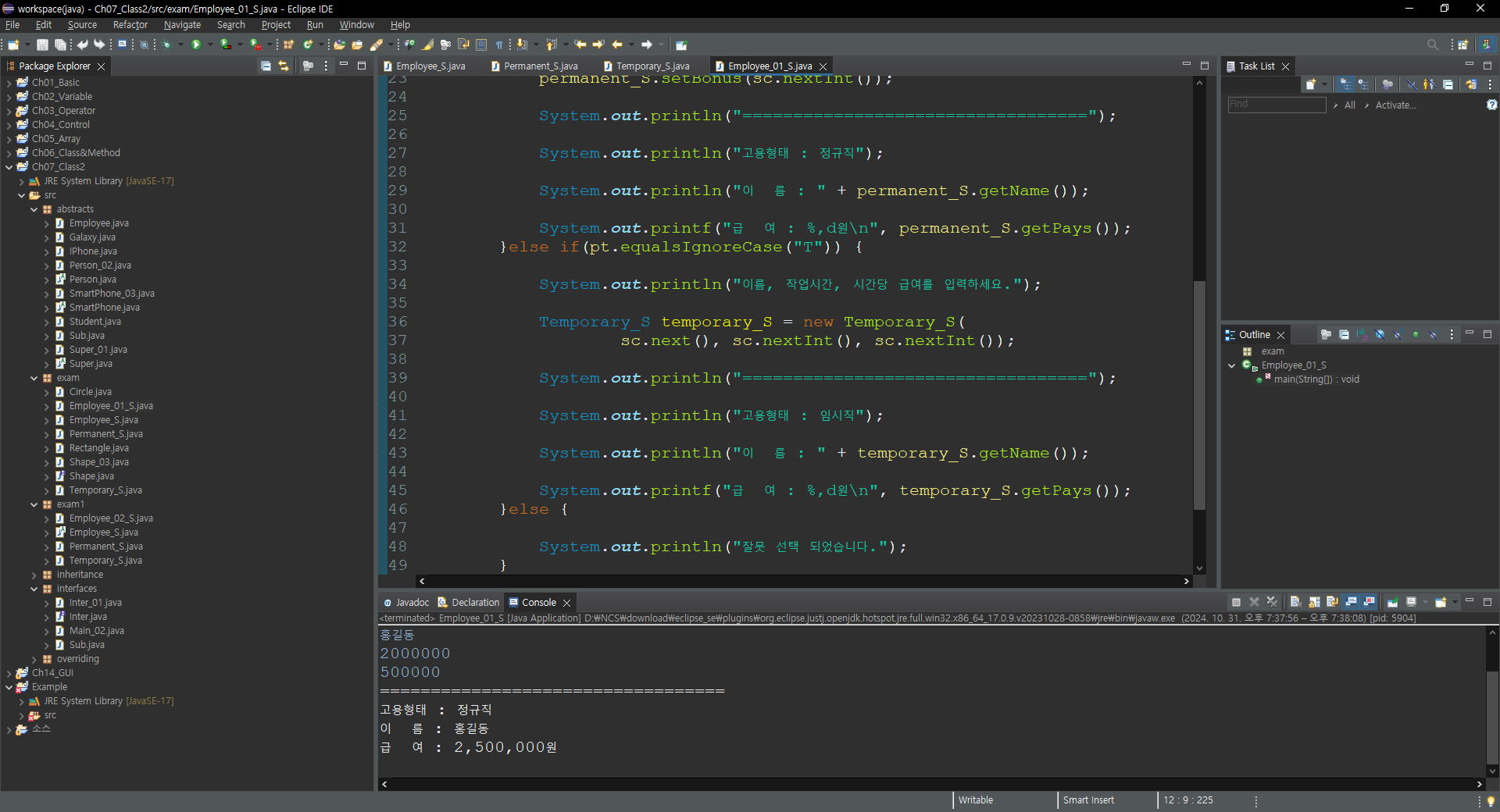 System.out.println("고용형태 : 정규직");