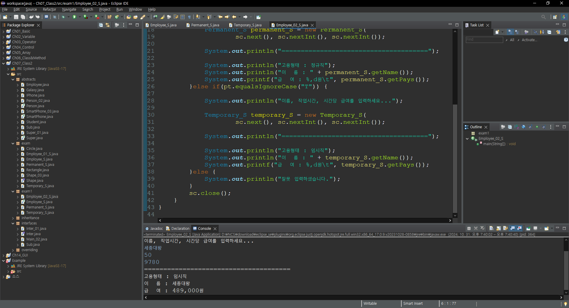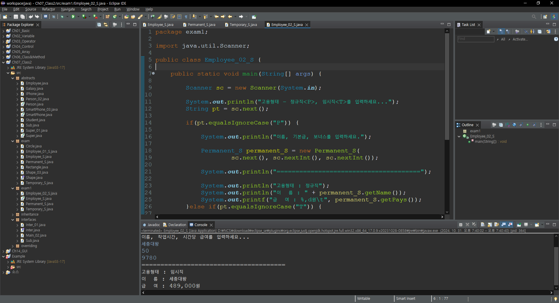 System.out.println("고용형태 - 정규직<P>, 임시직<T>를 입력하세요...");