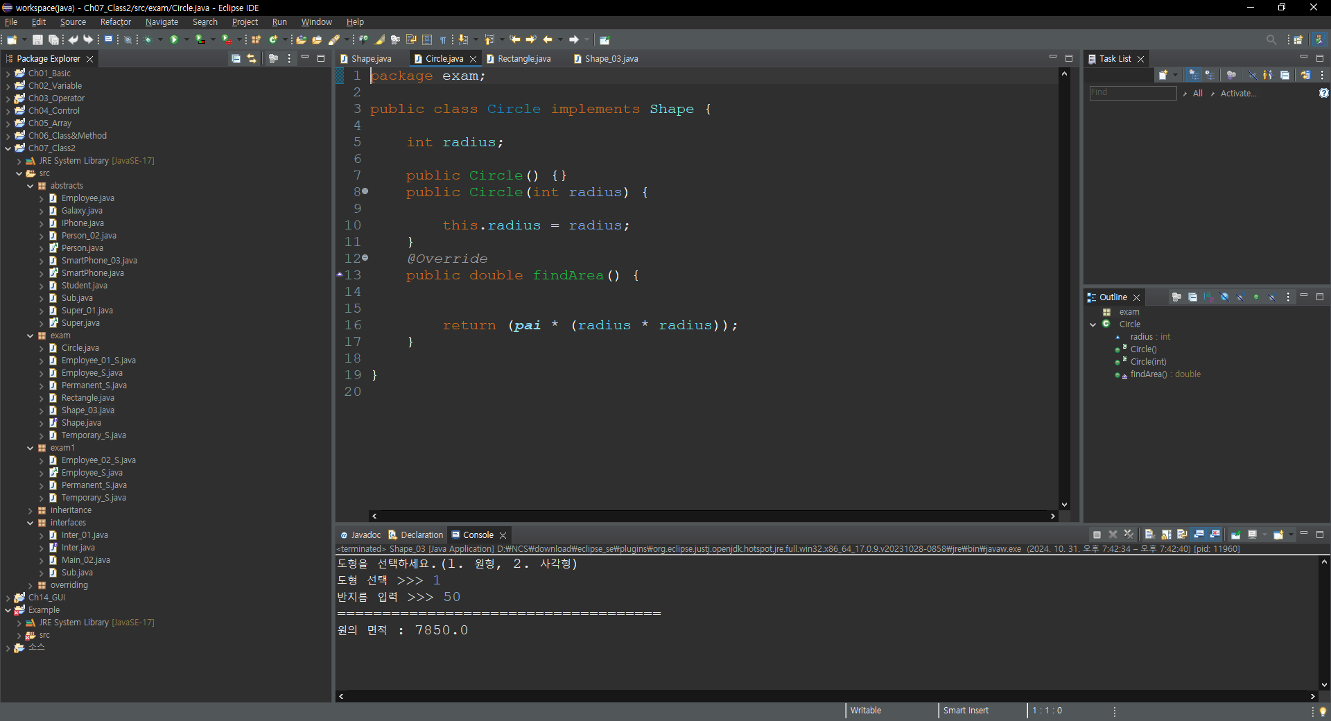 System.out.printf("원의 면적 : %.1f\n", circle.findArea());