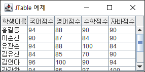 // JTable 컴포넌트는 컨테이너에 올리지 않고 바로 JFrame에 올림.