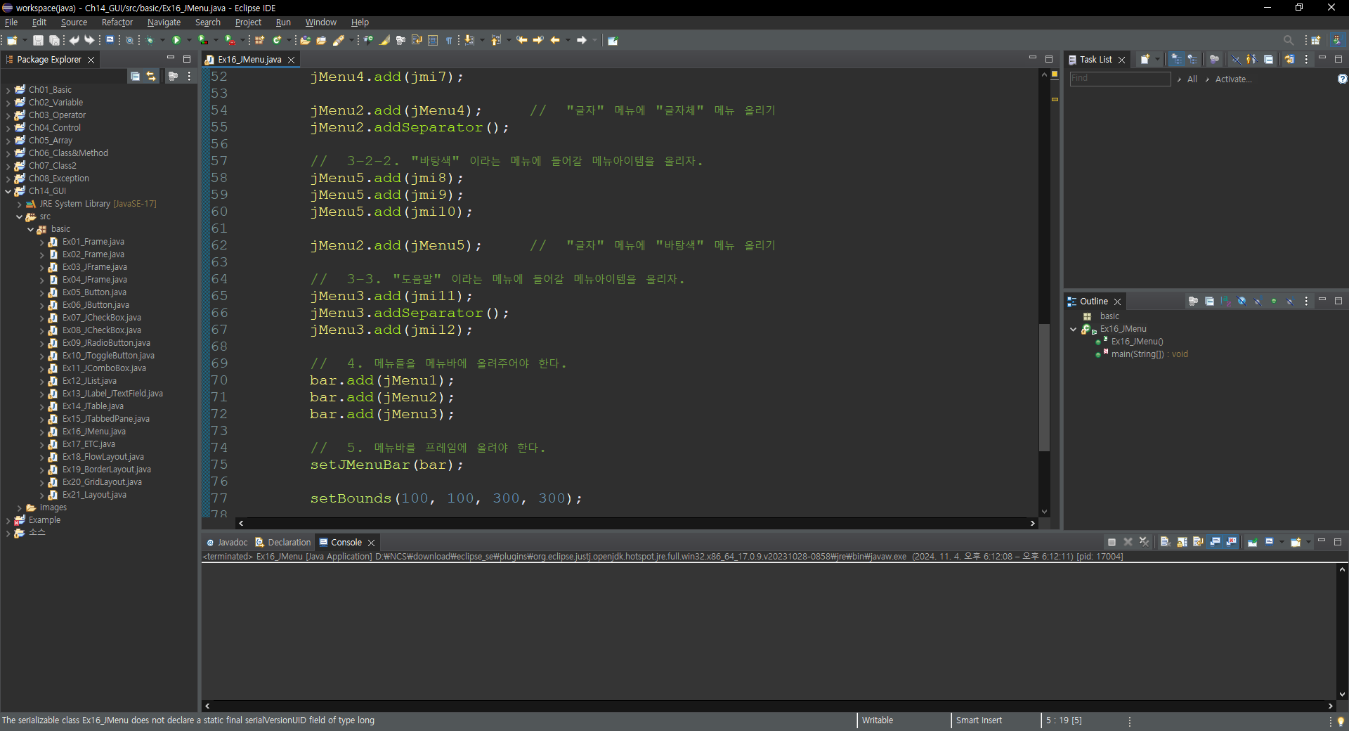 jMenu2.add(jMenu4); // "글자" 메뉴에 "글자체" 메뉴 올리기