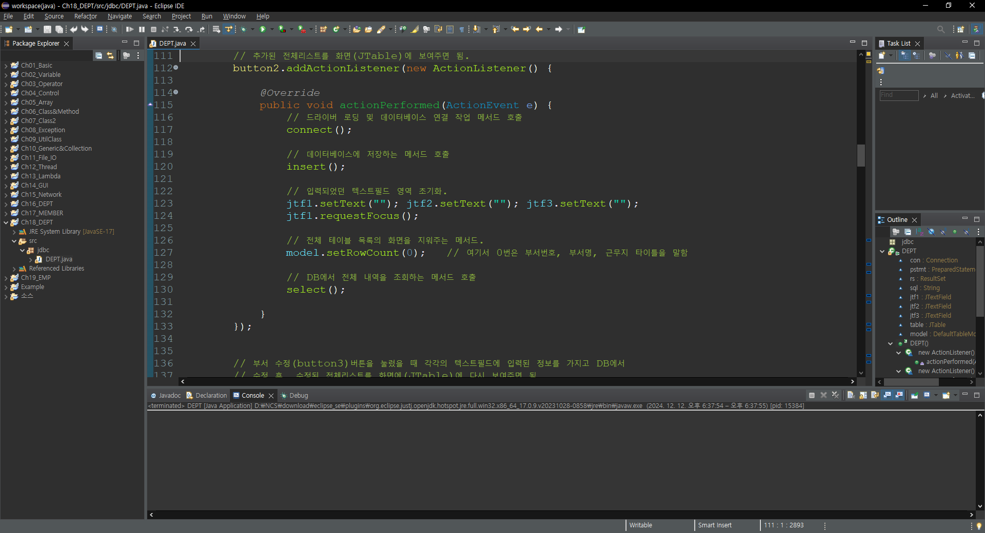 // 삭제 후에 DEPT 테이블의 전체 목록을 JTable에 다시 보여줌.
