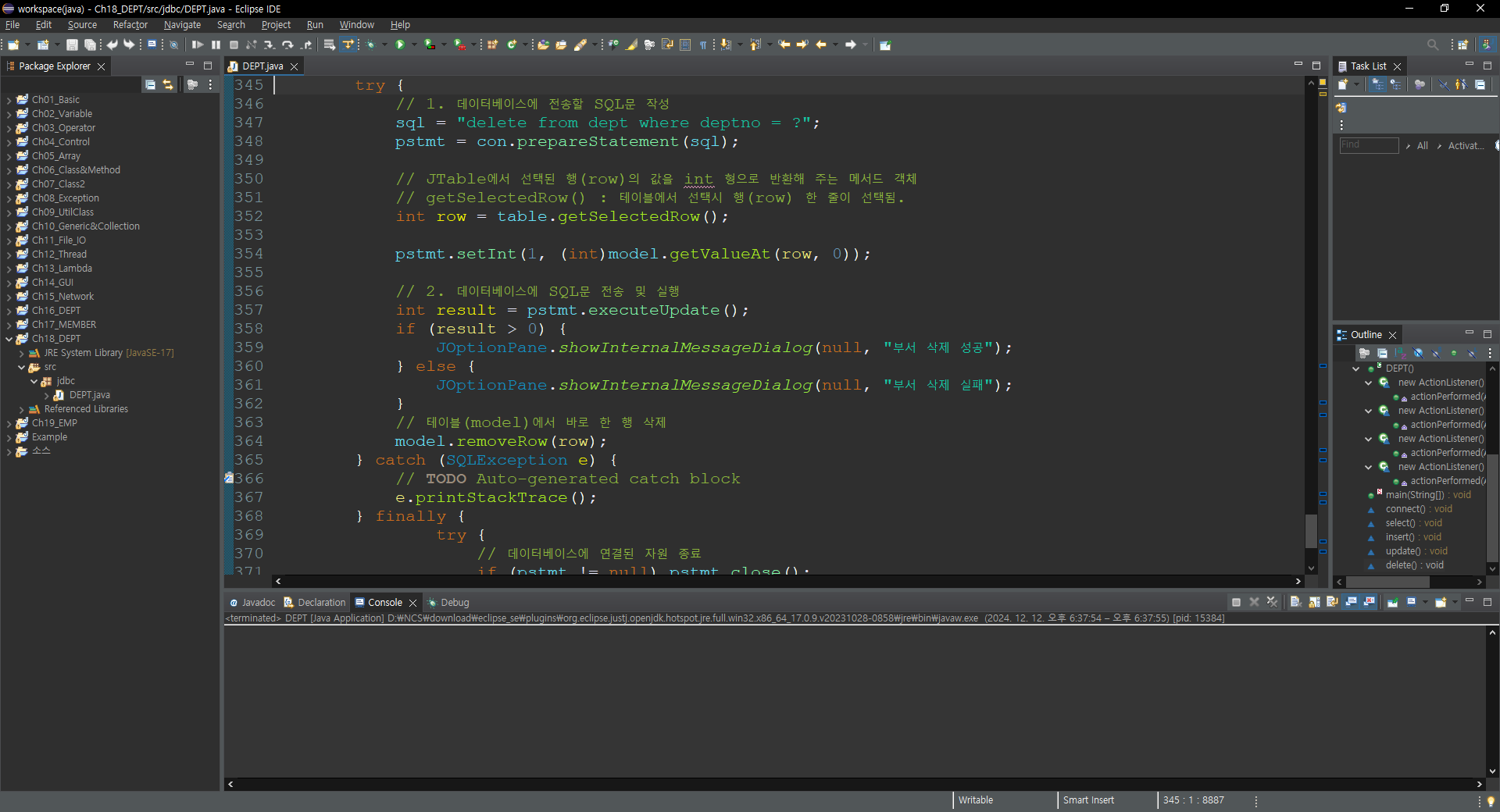 // DEPT 테이블에서 특정 행을 삭제시키는 메서드