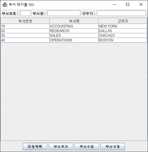 // 전체목록(button1)버튼을 클릭했을 떄 DEPT 테이블의 전체 목록을 JTable 출력