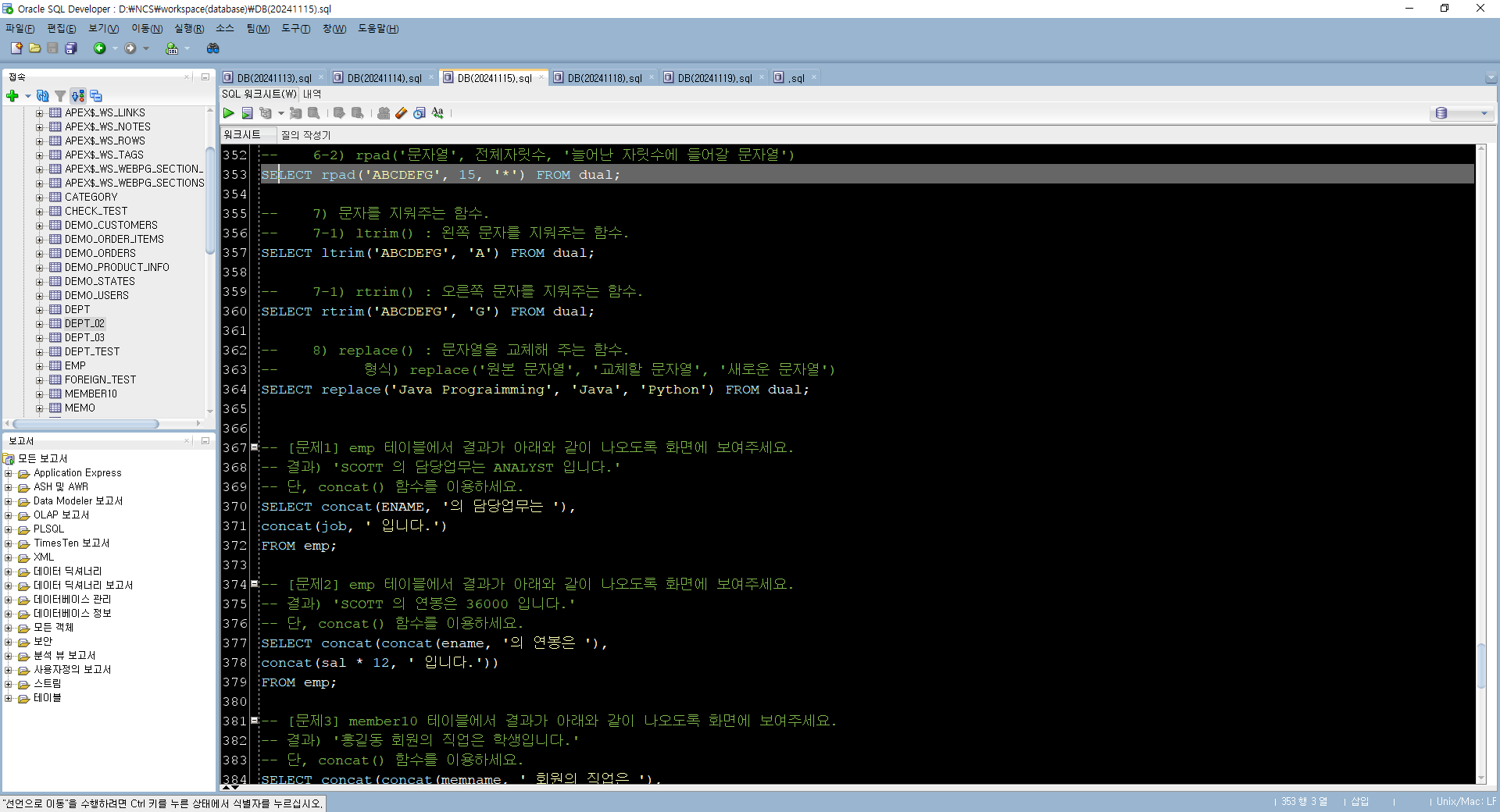 -- [문제6] emp 테이블에서 담당업무에 'A'라는 글자를 '$'로 바꾸어 화면에 보여주세요.