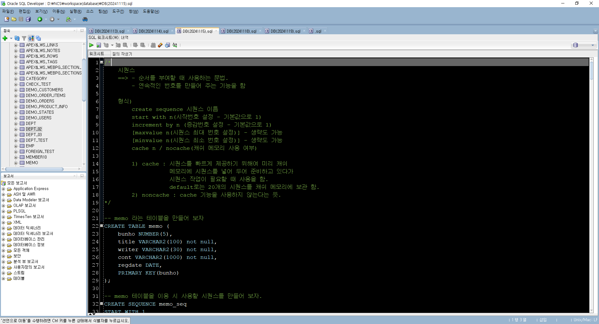 INSERT INTO memo VALUES(memo_seq.nextval, '메모1', '홍길동', '길동이 글이에요~~', sysdate);