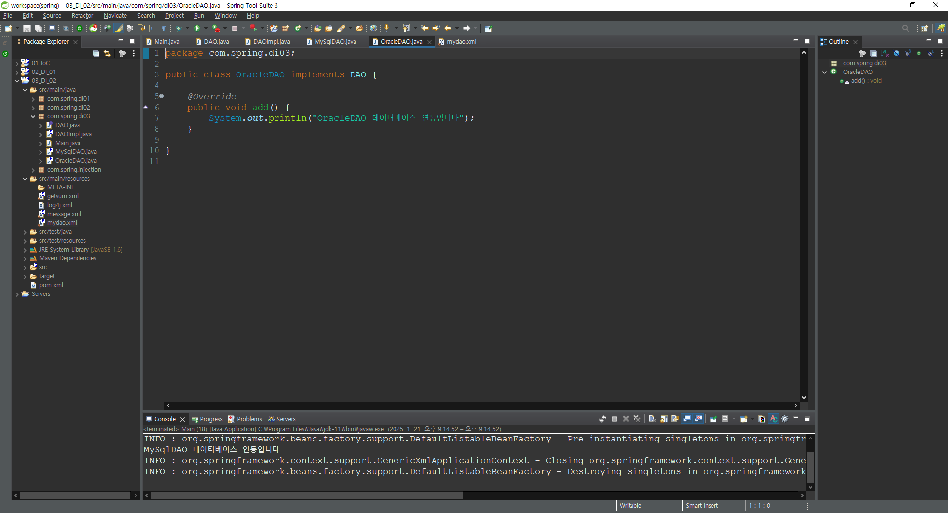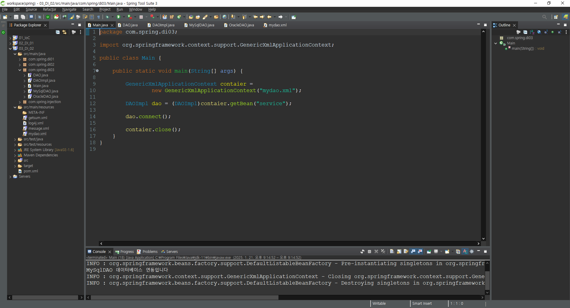INFO : org.springframework.context.support.GenericXmlApplicationContext - Closing org.springframework.context.support.GenericXmlApplicationContext@32cf48b7: startup date [Tue Jan 21 21:14:52 KST 2025]; root of context hierarchy