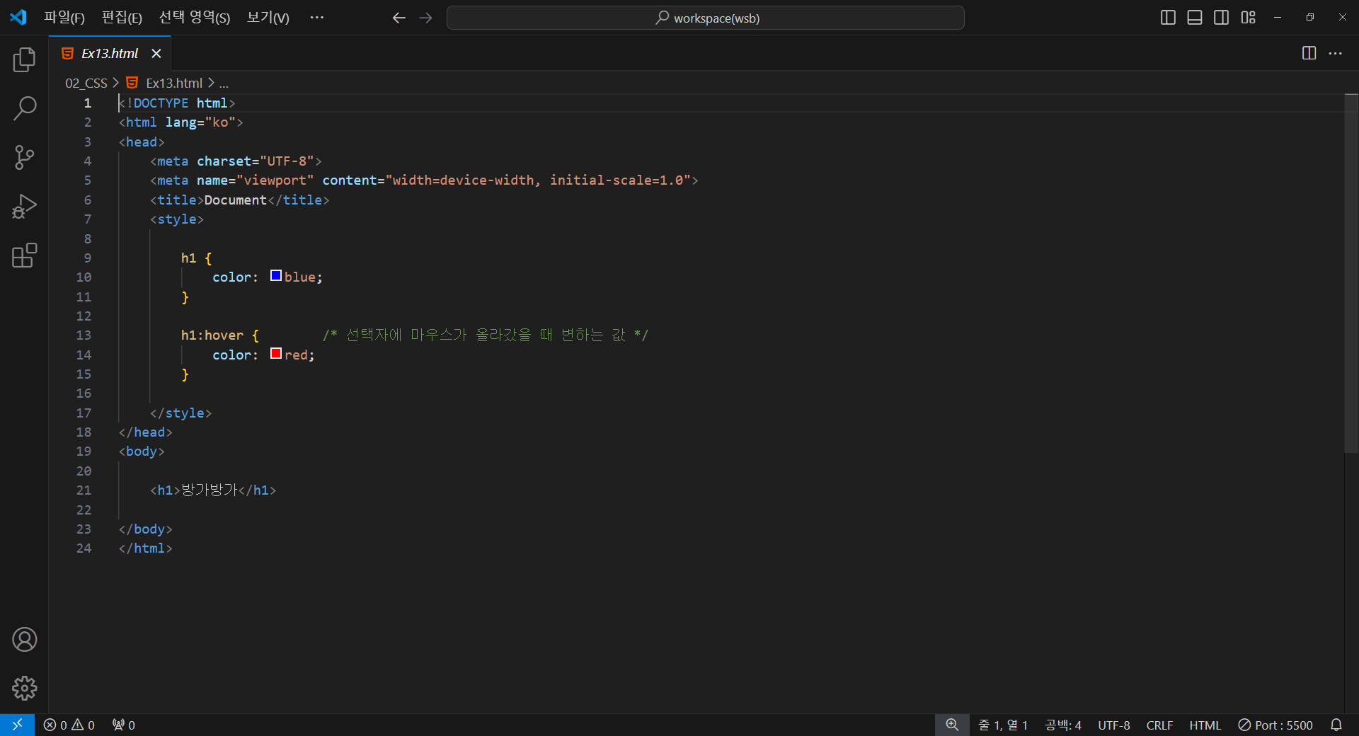 h1:hover { /* 선택자에 마우스가 올라갔을 때 변하는 값 */