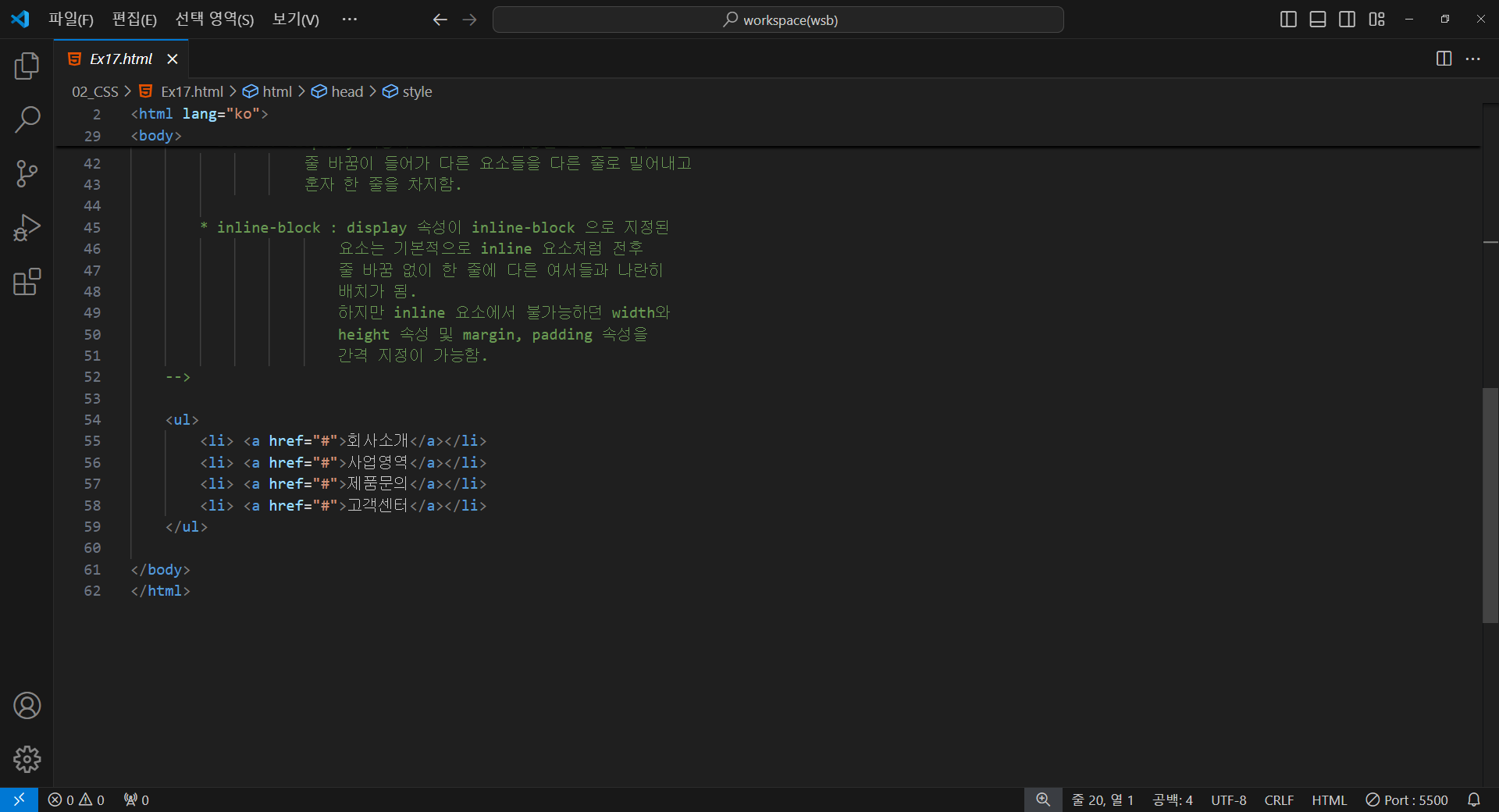 줄 바꿈 없이 한 줄에 다른 여서들과 나란히