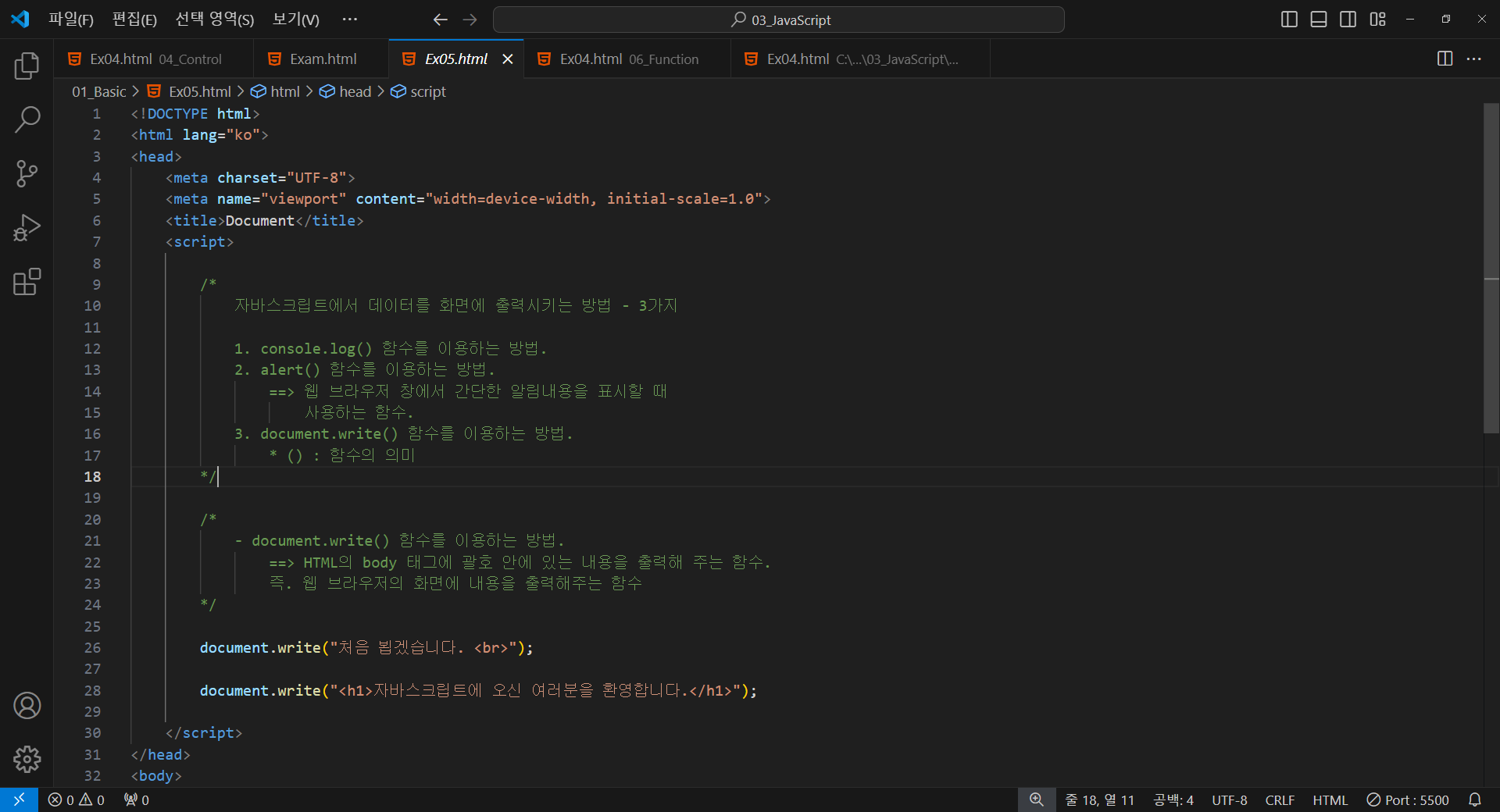 - document.write() 함수를 이용하는 방법.
