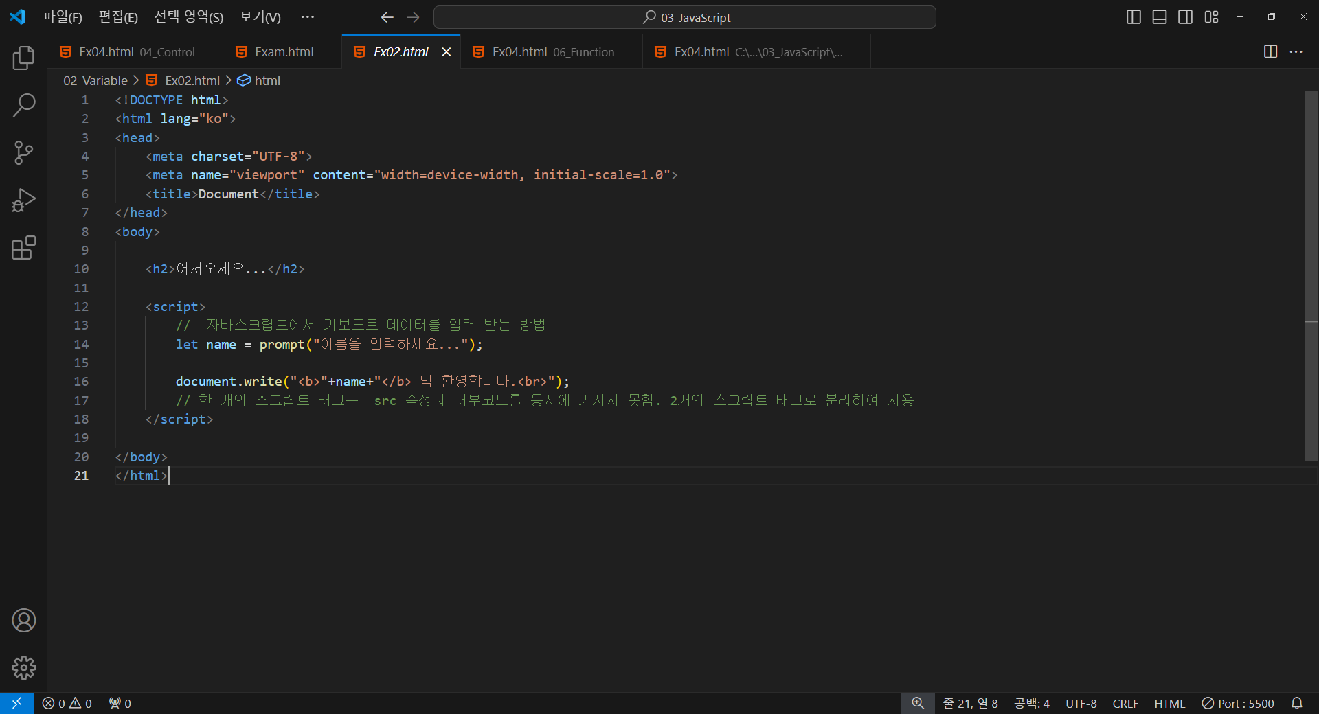 // 자바스크립트에서 키보드로 데이터를 입력 받는 방법