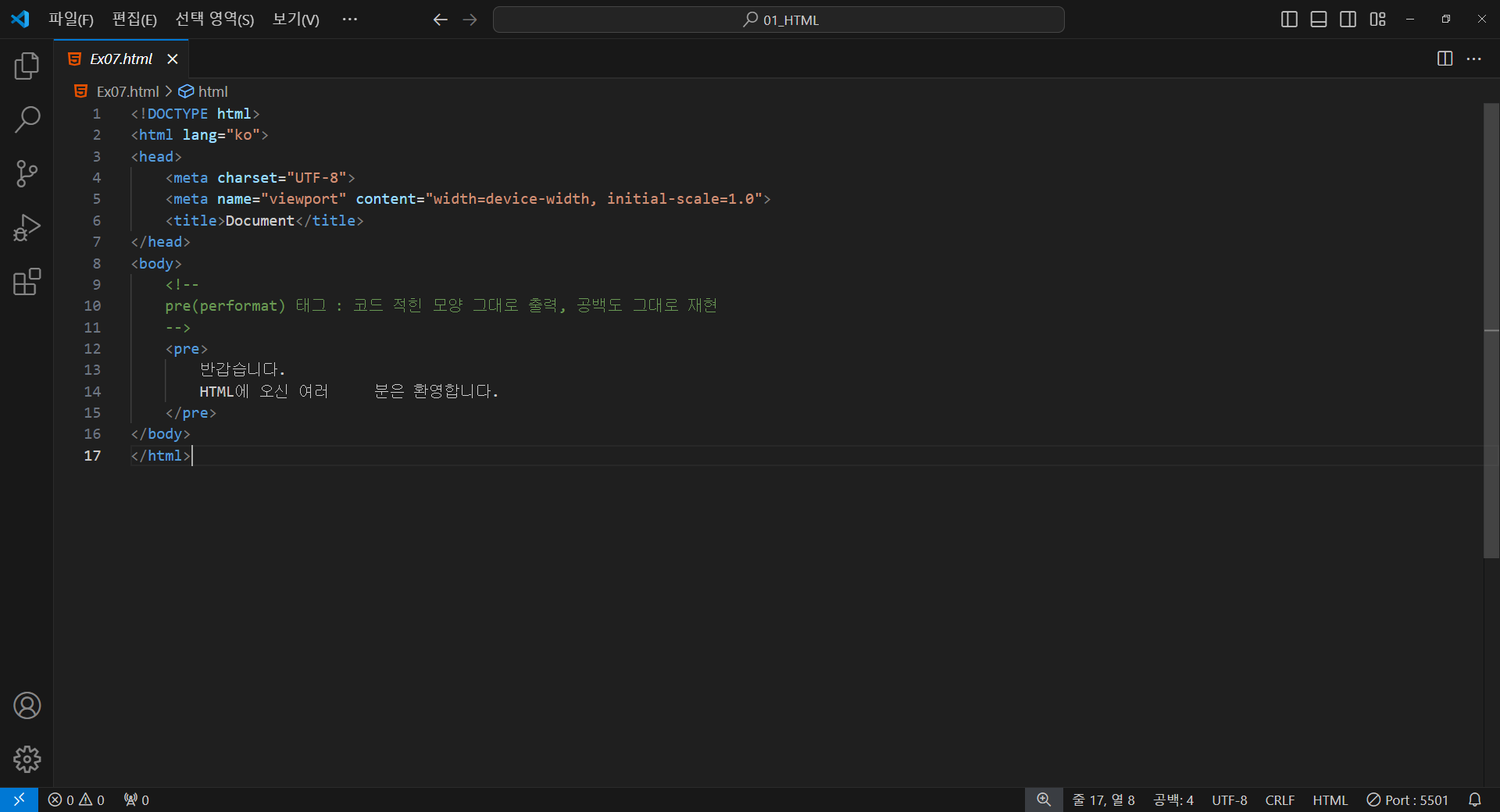 pre(performat) 태그 : 코드 적힌 모양 그대로 출력, 공백도 그대로 재현